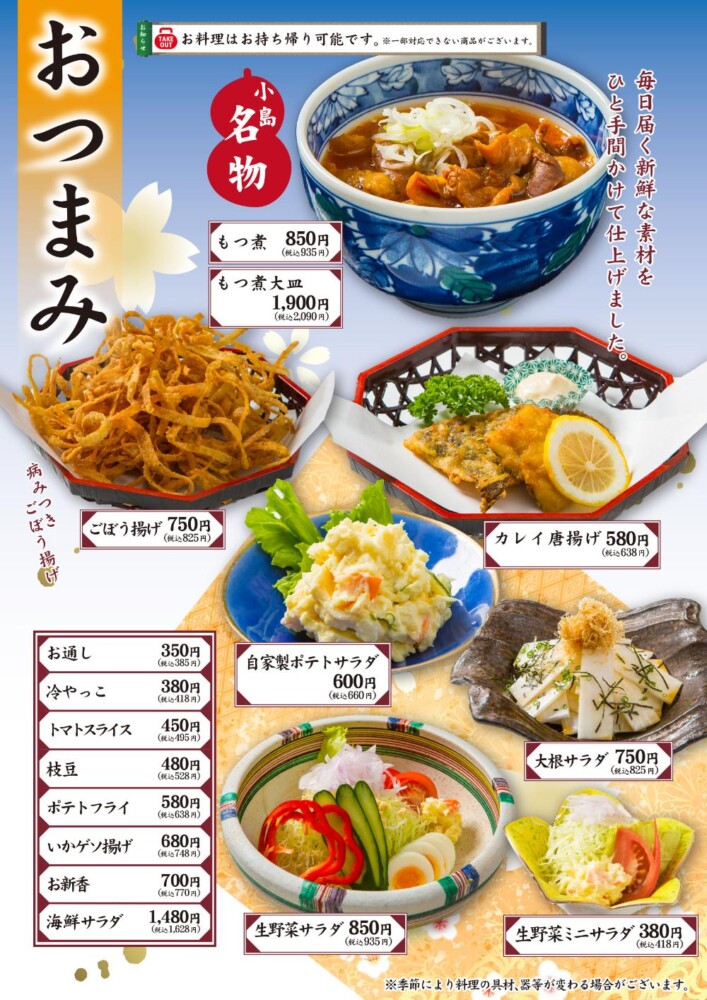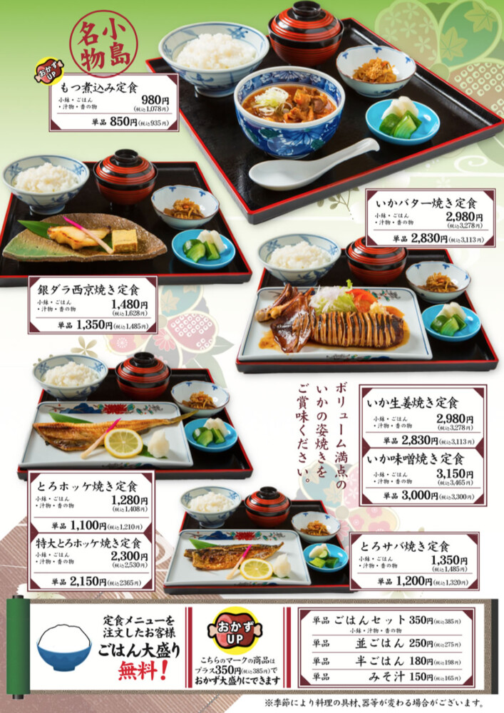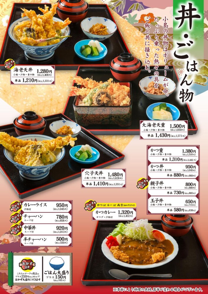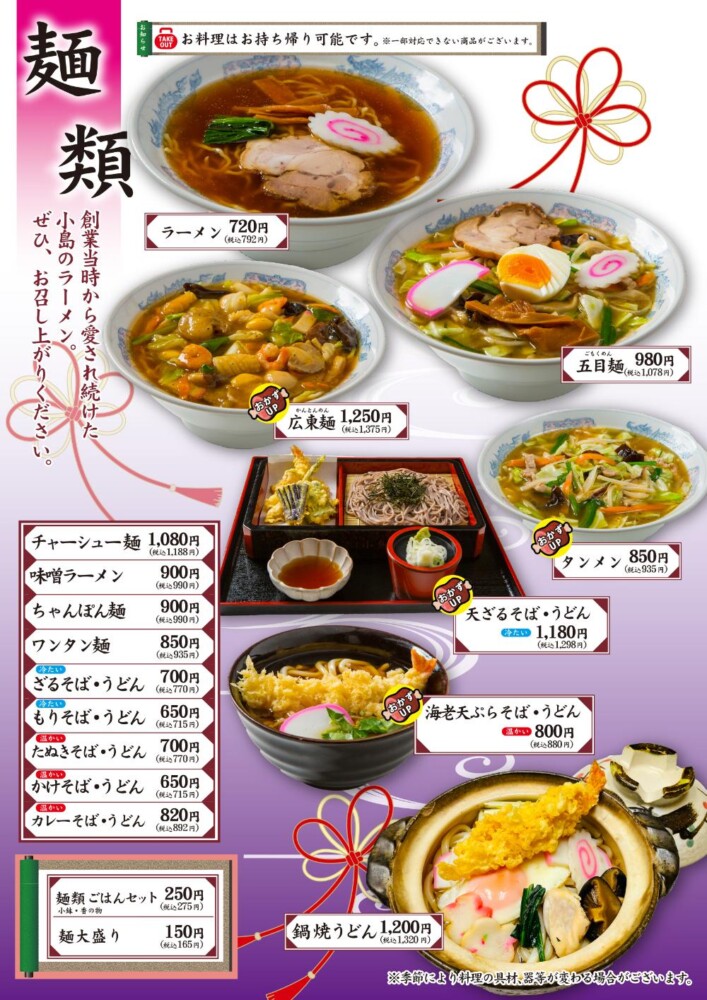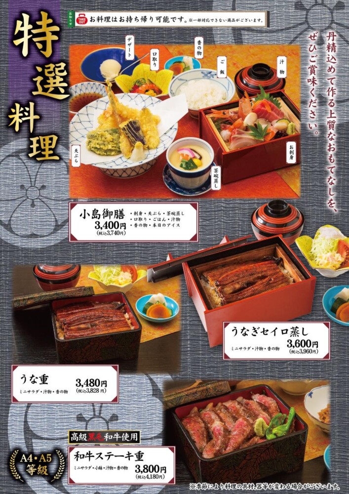 - 小島御膳、うなぎセイロ蒸し、鍋焼うどん、セットメニューはテイクアウト対象外です。